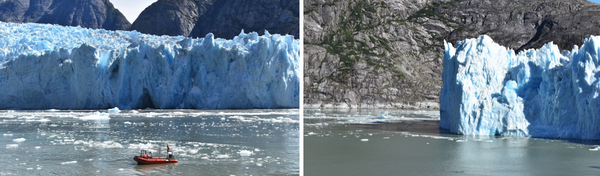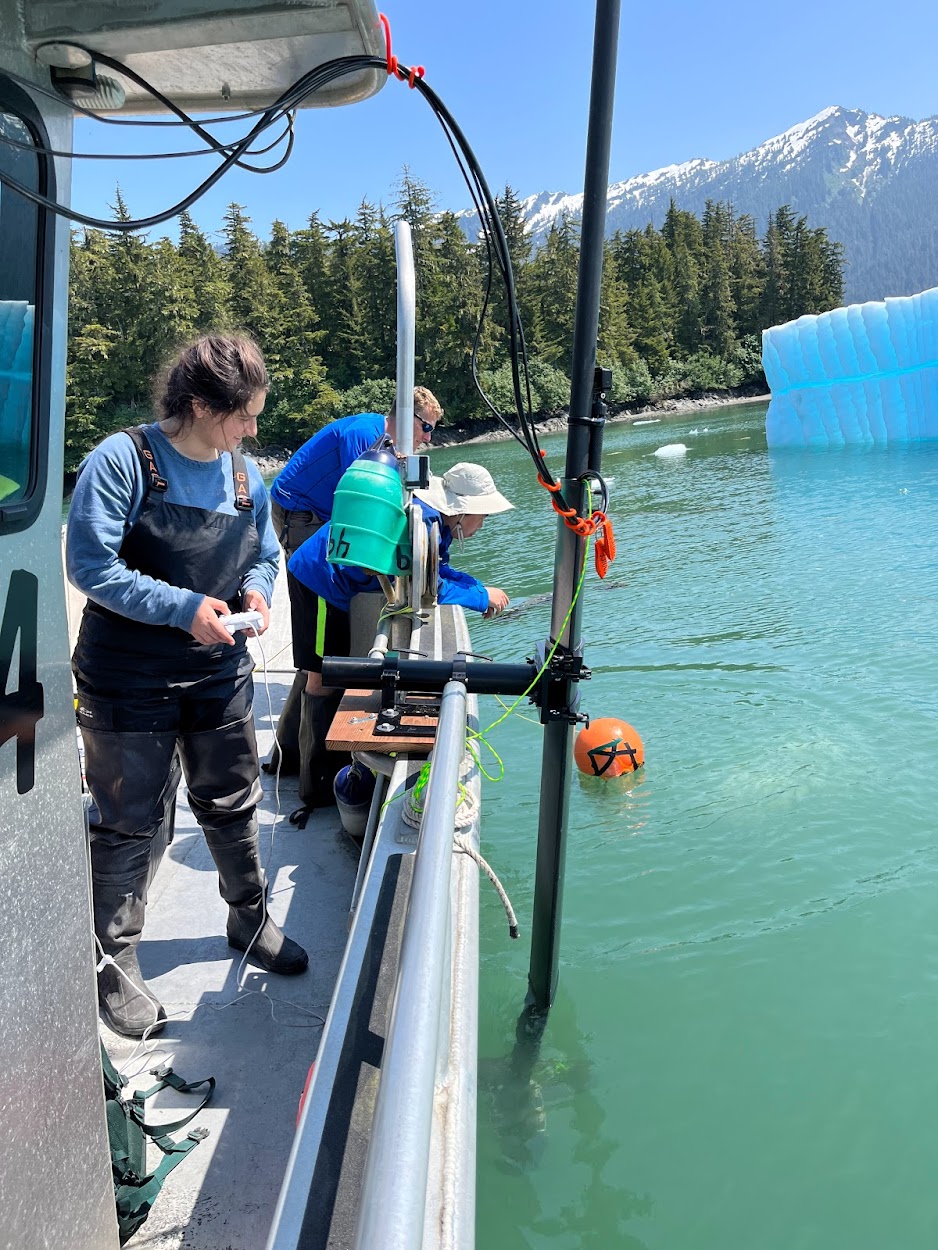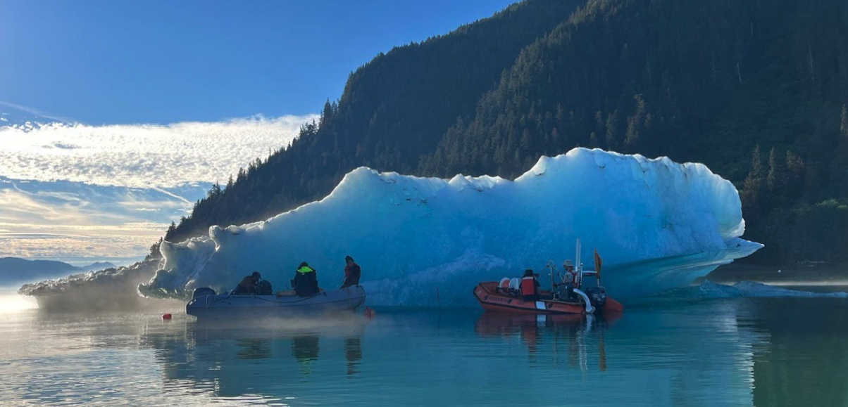 Field work within an Alaskan fjord measuring the ice-ocean boundary layer near icebergs.